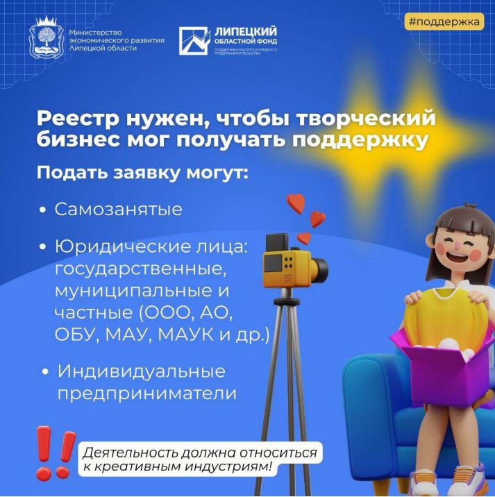 Министерство экономического развития Липецкой области приступает к формированию официального реестра субъектов креативных (творческих) индустрий. Реестр станет единой базой самозанятых, предпринимателей и организаций, работающих в креативных направлениях, и откроет доступ к мерам государственной поддержки.