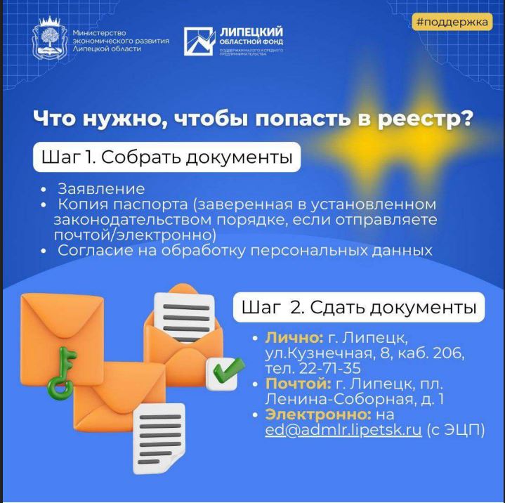 Процедура включения в реестр максимально упрощена. Для удобства потенциальных заявителей разработаны информационные карточки с пошаговым алгоритмом действий. Материалы помогут быстро подготовить необходимые документы и корректно оформить заявку.