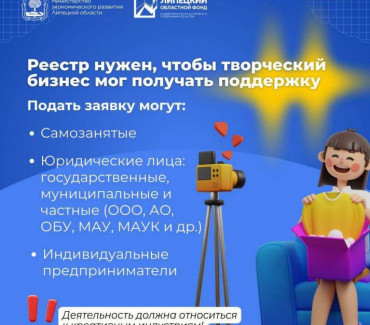 Министерство экономического развития Липецкой области приступает к формированию официального реестра субъектов креативных (творческих) индустрий. Реестр станет единой базой самозанятых, предпринимателей и организаций, работающих в креативных направлениях, и откроет доступ к мерам государственной поддержки.